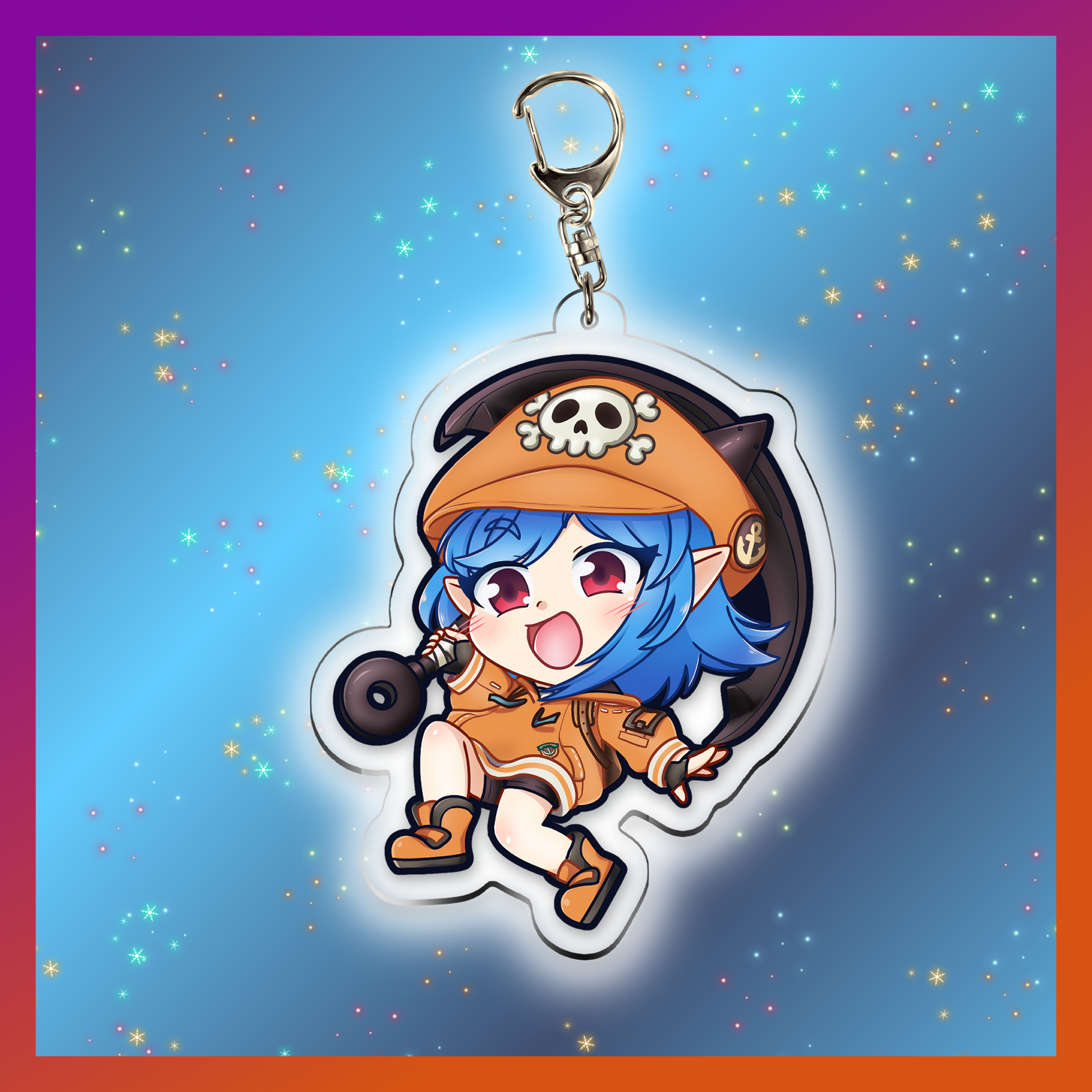 This keychain is made of Acrylic and features a dark rainbow iridescent star-shaped keychain clasp. Keychain is double sided and measures at 2.5 Inches tall.